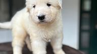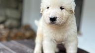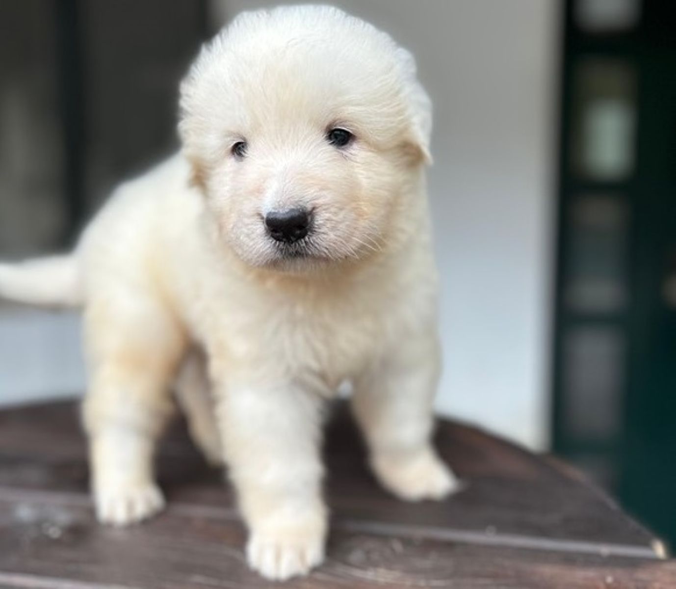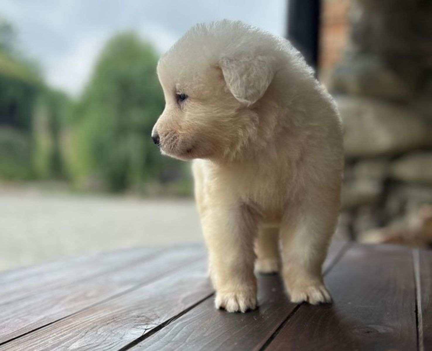 The coat, although still soft and typically puppy-like, is dense and already shows the texture that will become semi-rough in adulthood. Pure white in color, with no noticeable markings.