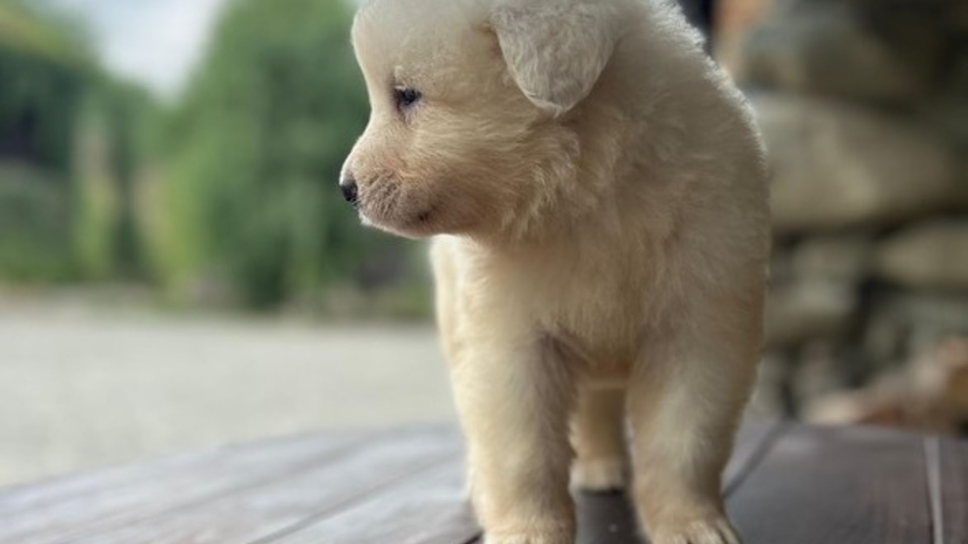 The puppy already shows the typical characteristics of the breed: a solid structure, well-proportioned limbs, strong bone structure, and good chest width for its age. The head is well-shaped, with a slightly convex skull and a gently defined stop, consistent with the breed standard. The nose is black and well-pigmented; the eyes, still darker than their final shade, are expressive and lively.